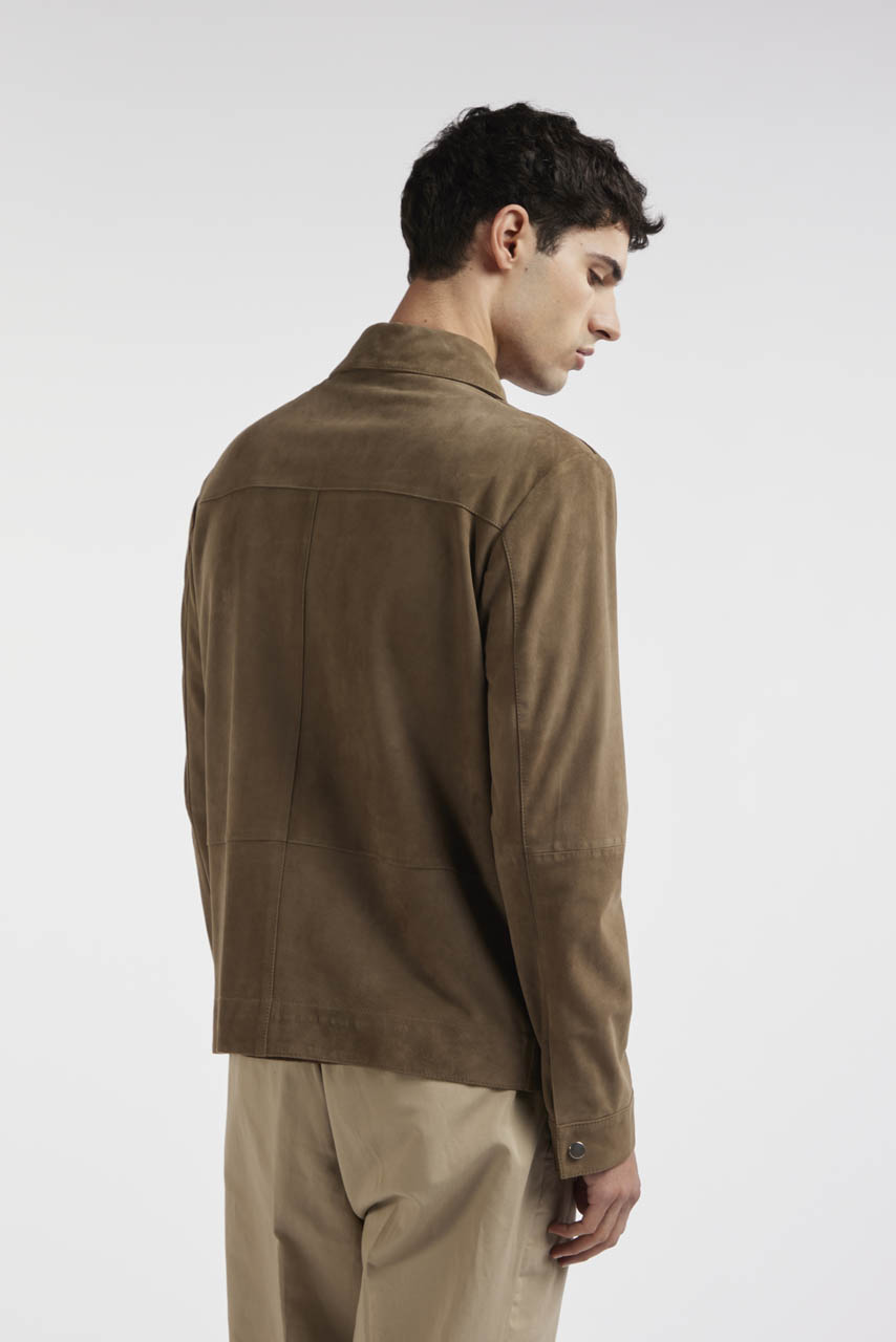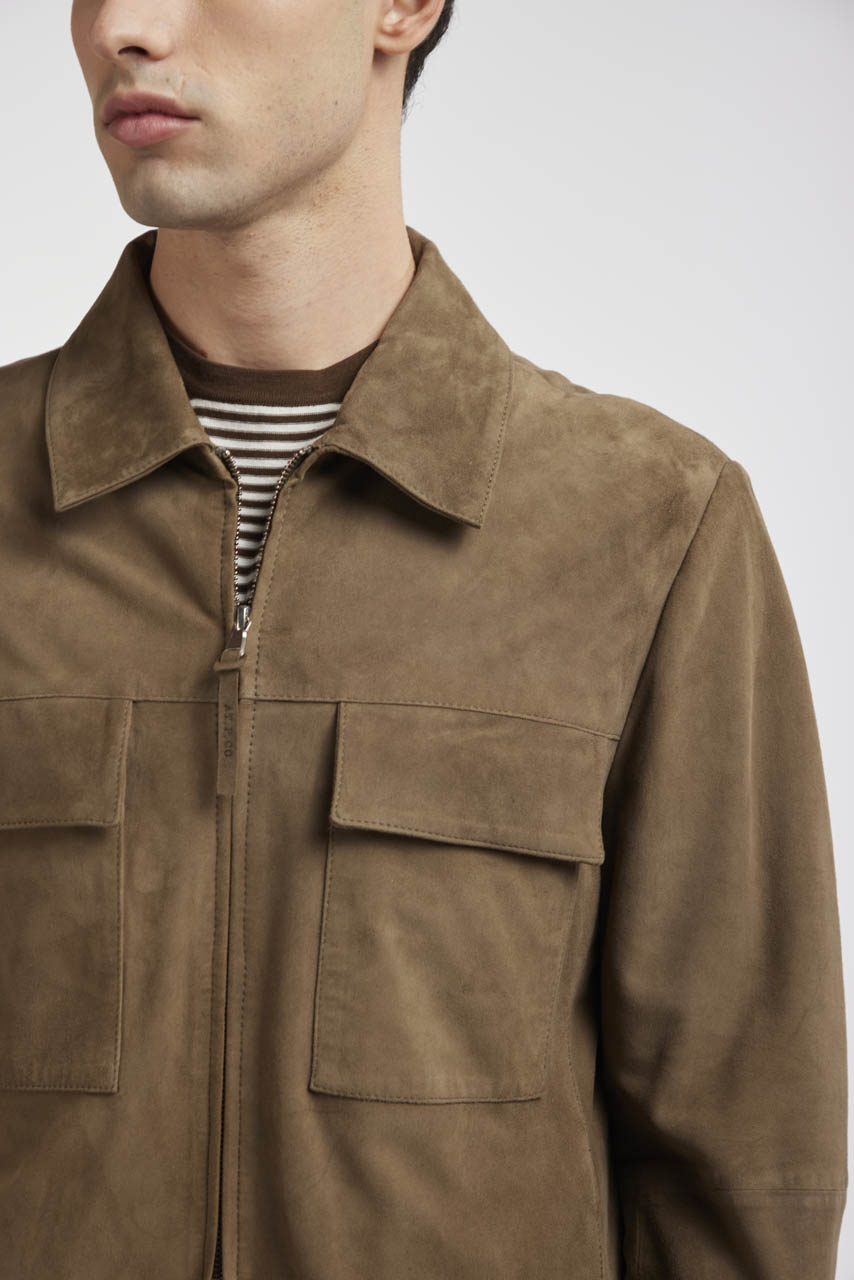 Jacket in soft suede featuring an essential and refined design. The classic collar and double-slider front zip define a clean and contemporary silhouette, while the chest patch pockets with flap add a functional utility-inspired detail. A versatile piece, ideal for completing refined casual looks.