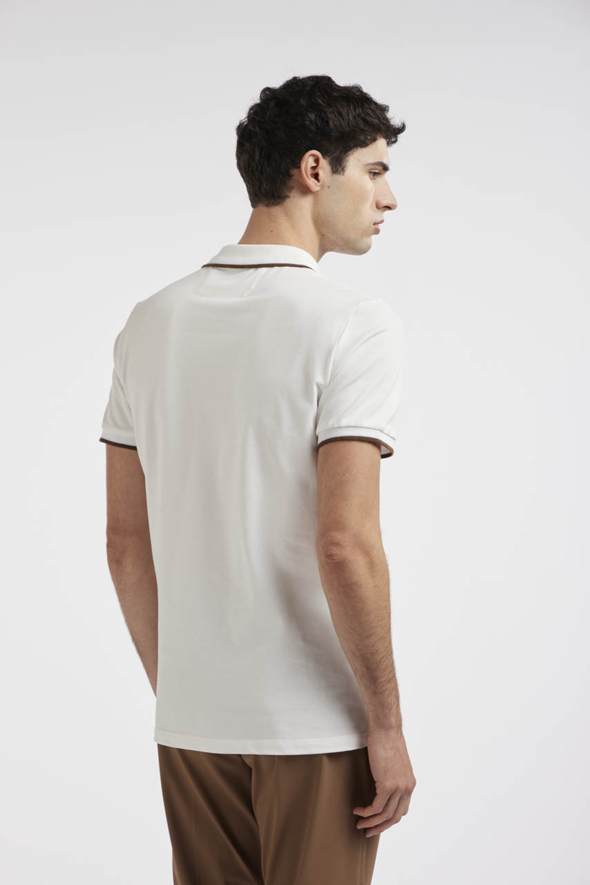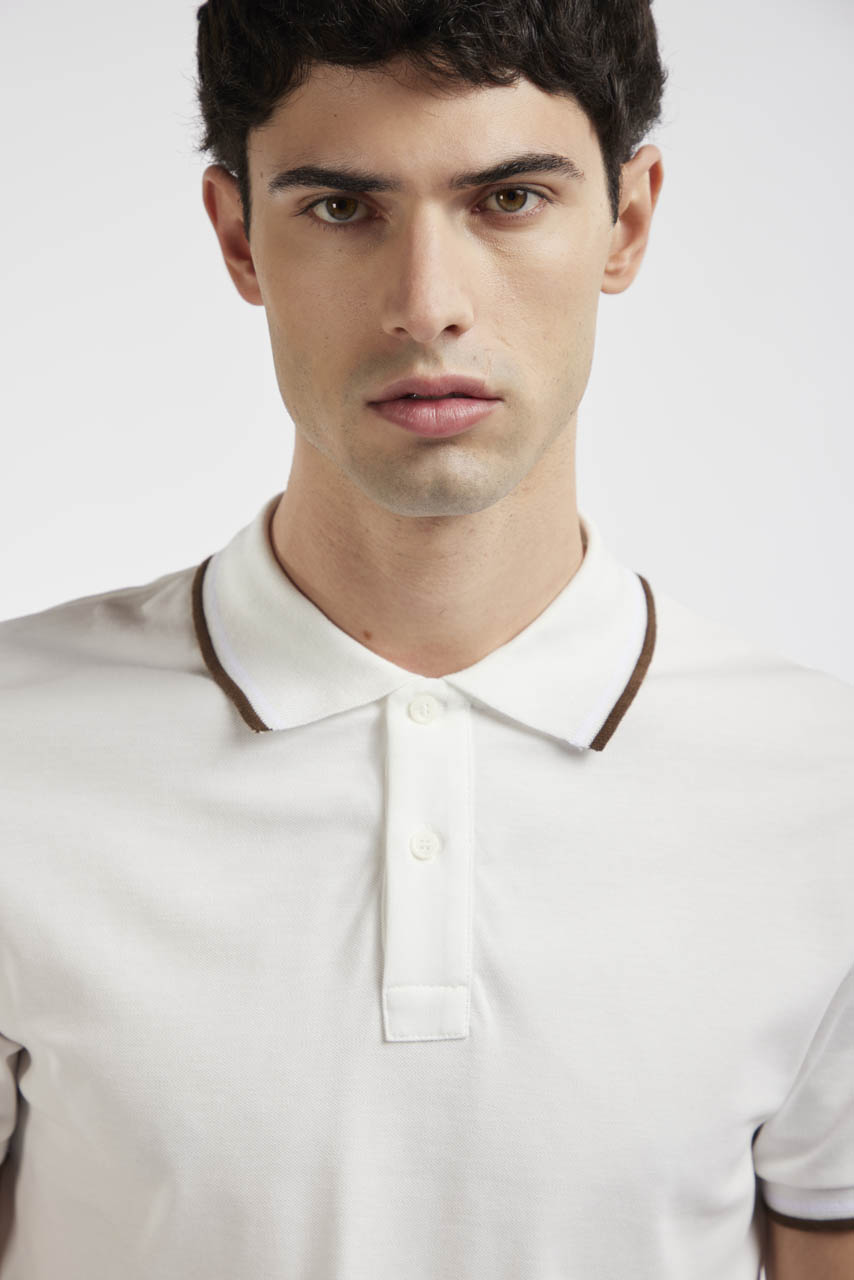 Short-sleeved polo shirt in stretch cotton piqué, fresh and comfortable. The style features a ribbed collar and sleeve hem with contrasting color detail and a two-button front closure, for a refined and versatile look.