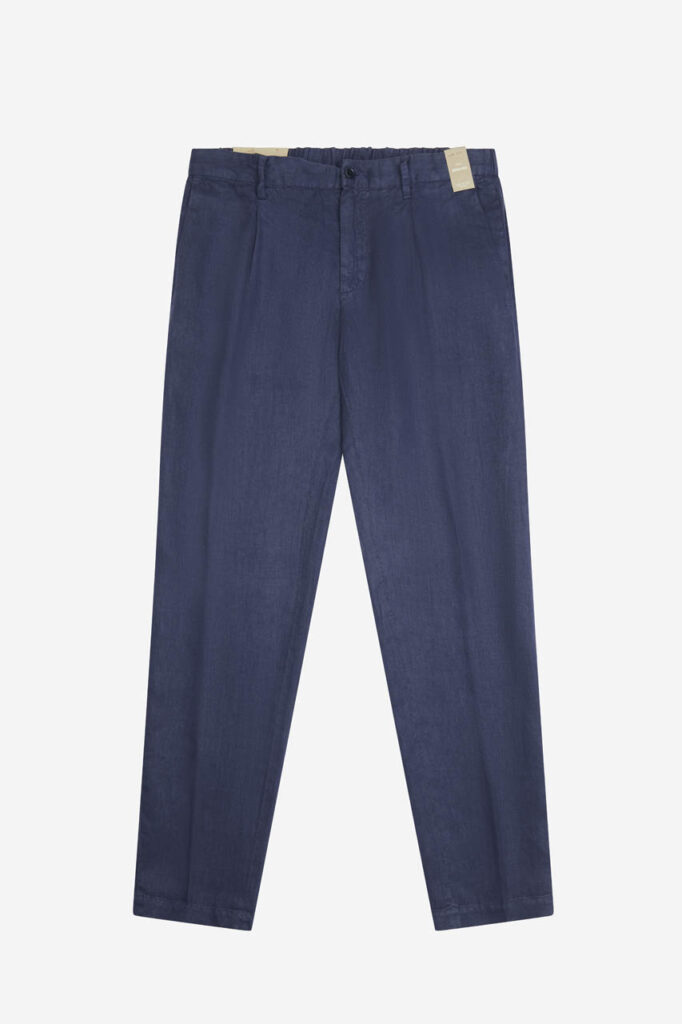 Linen trousers – model with elasticated waist adjustable with inner drawstring, side pockets, and back welt pockets.