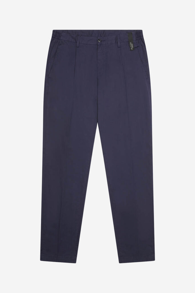 Il pantalone Berlino, realizzato in tessuto popeline stretch, unisce comfort e praticità grazie alla vita elasticizzata e alla coulisse interna regolabile. Completano il design le tasche laterali e le tasche a filetto sul retro.